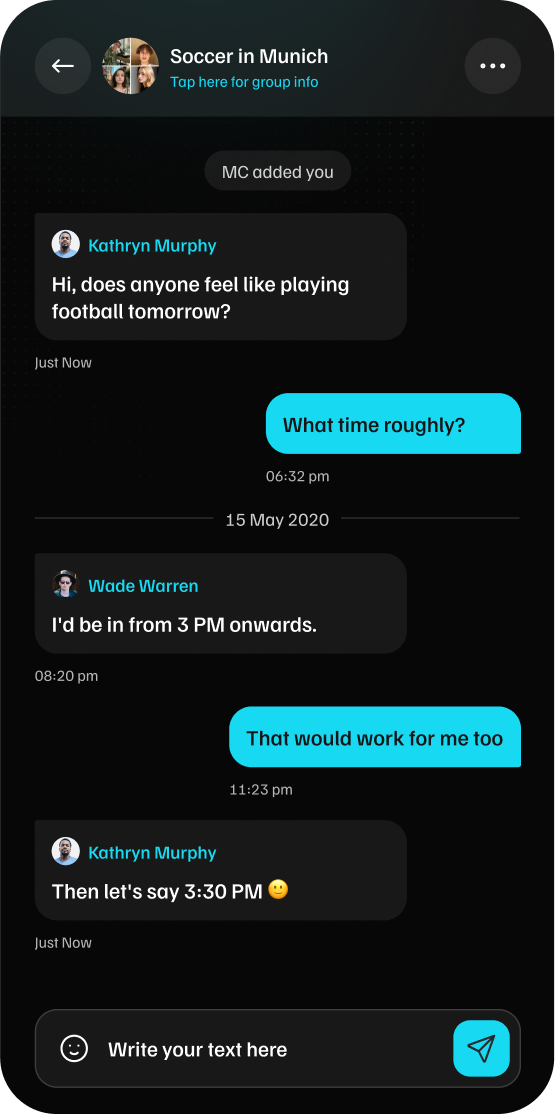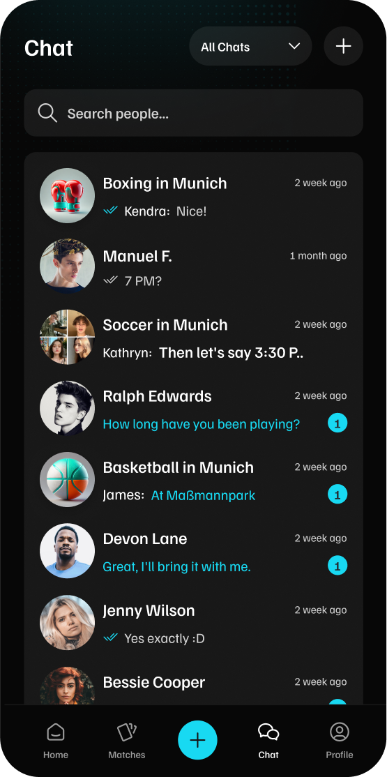Our built-in chat feature makes it easy and seamless to connect with other athletes. Set up spontaneous workouts, plan long-term training partnerships, or exchange tips and track your progress – all directly within the app, no detours needed.